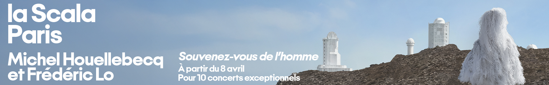 Michel Houellebecq et Frédéric Lo le présentent sur scène pour 10 concerts exceptionnels à partir du 8 avril à La Scala Paris, tous les mercredis et jeudis à 20h30.
